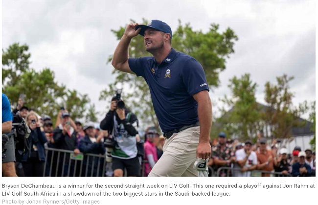 Per ESPN: “Bryson DeChambeau won for the second straight week by saving par on the final hole for a 6-under 65 and blistering a 3-wood from a wet lie in the rough on the par-5 18th in a playoff to set up birdie and defeat Jon Rahm at LIV Golf South Africa on Sunday…”